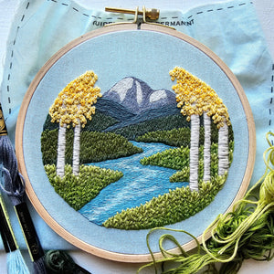 Escape into the mountains with the Aspen Vista embroidery kit by designer Jessica Long. This richly textured landscape uses layers of simple stitches to capture snowcapped peaks, rolling green hills, and golden aspen trees reflected in a winding river. The project is a rewarding challenge for stitchers ready to experiment with blending and shading using long and short stitch. While the written instructions are detailed, there is no video tutorial for this design, so it’s best suited for those with some embroidery experience.