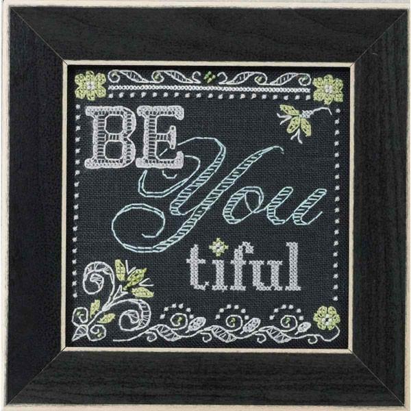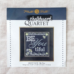 This kit is part of a series of four chalkboard-inspired designs by Mill HIll. It comes with everything you need to stitch, including black linen fabric, needles, thread, and instructions.