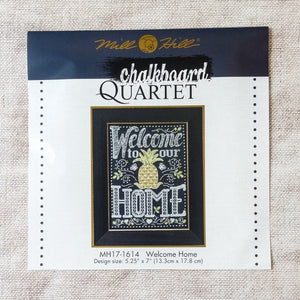 This kit is part of a series of four chalkboard-inspired designs by Mill Hill. It comes with everything you need to stitch, including black linen fabric, needles, thread, and instructions.