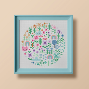 Step into a world of soft color and whimsy with Mini Pastel Garden, a modern cross stitch pattern by Una Buena Pieza. This sweet design is filled with tiny flowers, rainbows, clouds, and playful shapes in cheerful pastel tones. Perfect for beginners or anyone who loves a lighthearted stitch, it’s a little garden that blooms with every cross.