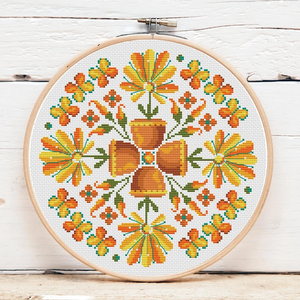Bright and cheerful, Sun in a Pot by Artmishka Cross Stitch celebrates sunny days and simple joys. Golden blooms burst from terracotta pots in a symmetrical mandala-style design that’s both modern and timeless. With its warm palette of yellows and oranges, this counted cross stitch pattern adds a happy pop of color to any space.