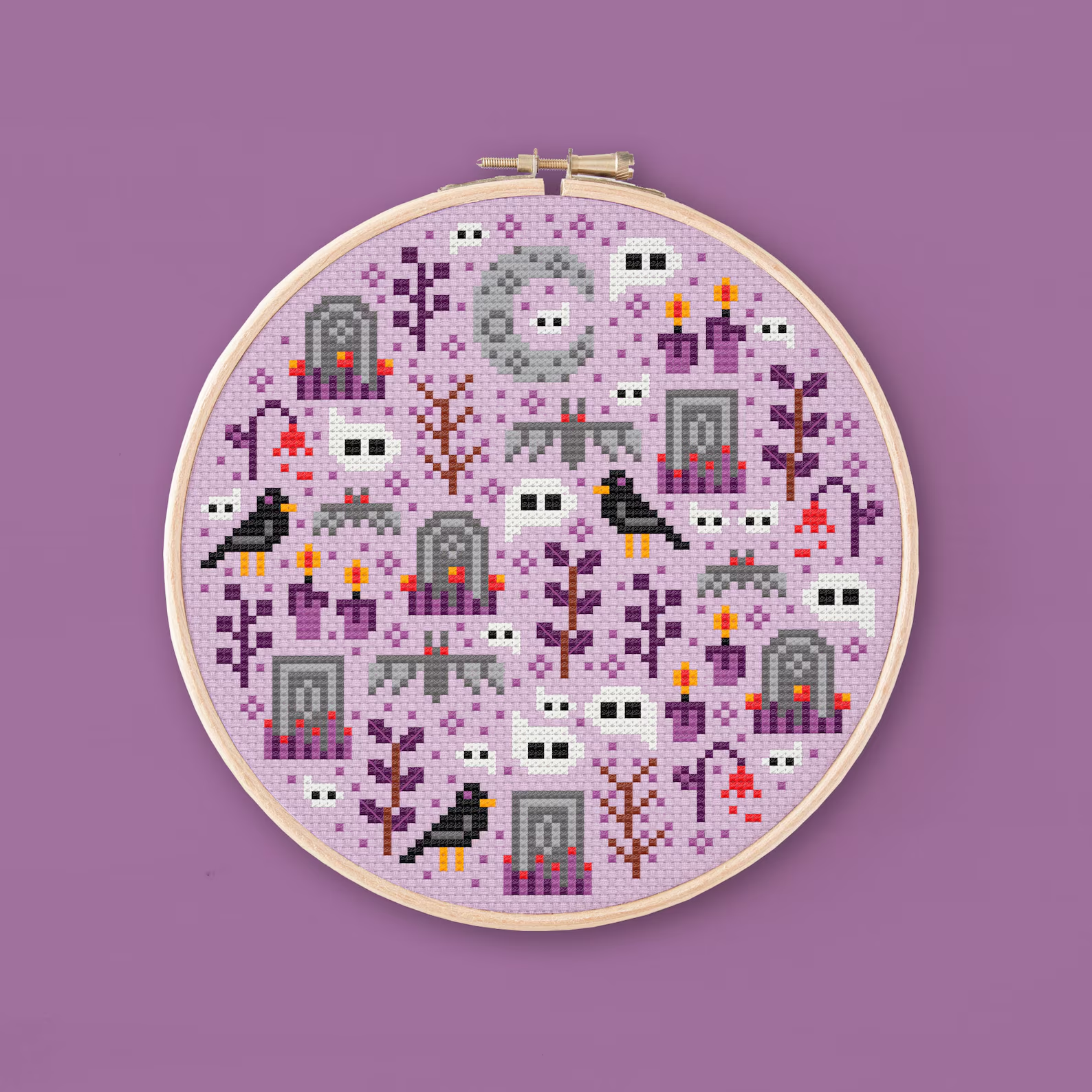 Hauntingly beautiful and full of detail, Victorian Graveyard by Una Buena Pieza is a spooky cross stitch pattern stitched in the brand’s signature pixel-art style. Ghosts, crows, and flickering candles drift among headstones and shadowy trees, all rendered in soft purples and grays for a touch of gothic charm. Perfect for Halloween or year-round lovers of the eerie and atmospheric.